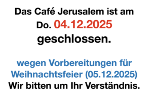 Wir als Café Jerusalem möchten uns bei den Menschen dieser Stadt bedanken, die dem Café immer zur Seite gestanden haben und uns geholfen haben, eine Hilfe für die Menschen am Rande der Gesellschaft zu sein.
